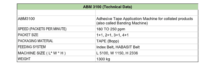 ABM 3100 is an adhesive tape application machine also called banding machine that automatically collates desired number of wrapped soaps in up-right position and then applies printed adhesive tape on both sides. Infeed conveyor of the machine is linked to the discharge belt of the wrapping machine. Product sensors and PLC based logic maintains right amount of queue on the infeed conveyor of the machine. The machine can operate at